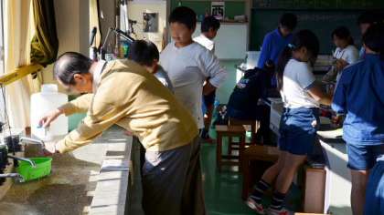 5日(木)、6年1組の理科実験のようすです。6年生は「水溶液の性質」の学習をしています。今回から理科の実験などの授業には「理科支援員」がついています。今日も支援員さんが担任の助手となり、実験の準備や片付け、補助、子どもたちへのアドバイスなどをしてくださっています。