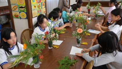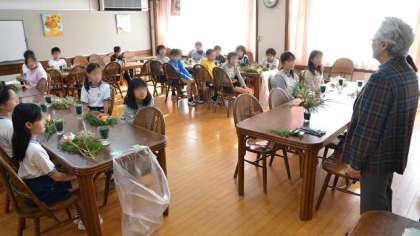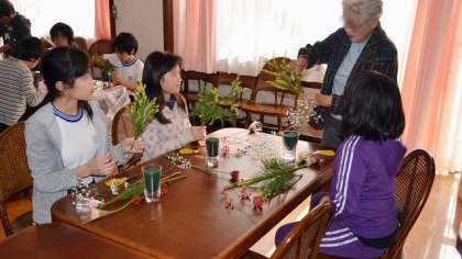 講師の先生は毎年お願いしている地元の方です。お忙しいところ、こどもたちのためにということで、快く講師を引き受けていただいています。写真は華道のようすです。クリスマスにちなんだ題材です。