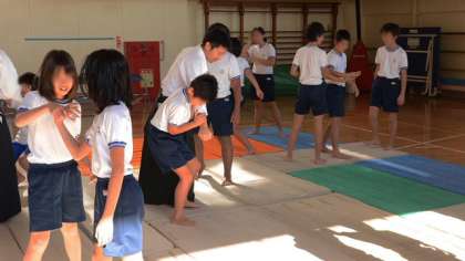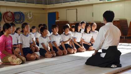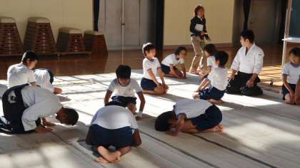 写真は合氣道のようすです。座り方、立ち方の基本、「氣」について実演や体験を通して学びました。体験を積み重ねていくうちに、子どもたちの姿勢がよくなっていきます。合氣道の技も教えていただきました。