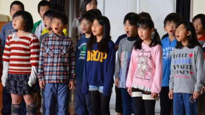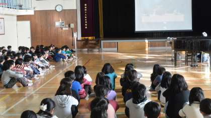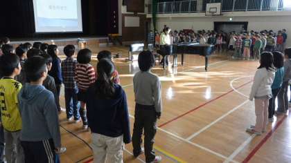 13日(金)朝、体育館で音楽朝会を行いました。最初に、今年生誕200年という作曲家ワグナーとベルディについて、音楽専科教員から音楽とスライドを使って紹介をしました。歌劇を聴かせることによって、この後の動機付けをはかったということです。その後いよいよ子どもたちの歌です。今日は今月の歌「君をのせて」です。「オペラ歌手になったつもりで、気持ちよく歌おう」という呼びかけ通り、子どもたちが一生懸命歌いました。