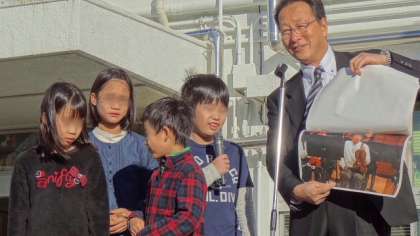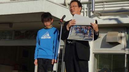 16日(月)朝会は校庭の芝生で行いました。今日も朝から冷え込みましたが、朝日がさんさんと差す南側の芝生は、上着をぬいでも我慢できないほどの寒さではありません。子どもたちは姿勢良く話を聞くことができました。今日は地域で活躍している子どもたちの紹介をしました。最初に昨日の「世田谷子ども駅伝」に出場した6年男子に話を聞き、表彰をしました。続いてこれも昨日行われた「子どもぶんか村音楽くらぶコンサート」に出演したジュニアコーラス2名とジュニアオーケストラ4名の児童の紹介をしました。質問にはっきりと答えることができ、みんなから大きな拍手をうけました。
