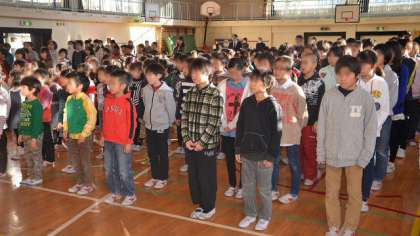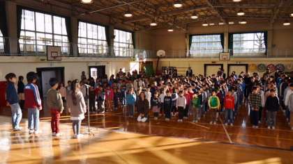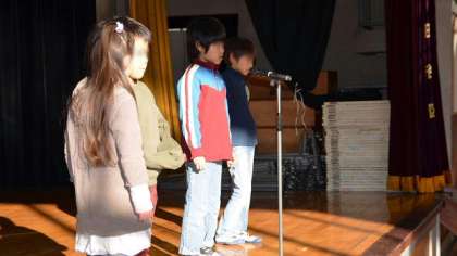 25日、今朝は体育館で2学期終業式を行いました。最初に1年生2名、3年生2名の代表児童が、2学期を振り返ってと3学期への抱負を述べました。4人とも原稿なしで、大きなはっきりした子でお話しできました。すてきな子どもたちです。来年に向けて、今日話したことが実現するようがんばってくださいね。