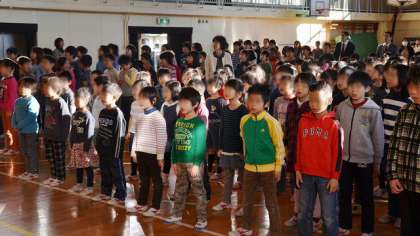 校長講話では、来年に向けてどんな目標をもつか、ぜひ家族で話しあってくるようにと宿題を出しました。各家庭の団らんで話題にしてください。講話の後、今年最後にみんなで歌う校歌です。すっかり歌に自信をもつようになった子どもたち。声たからかに美しい歌声が体育館に響き渡りました。