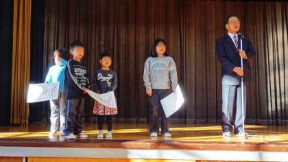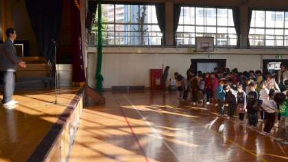 終業式はこれで終了。その後に生活指導の先生から、冬休み中に健康で安全にすごすための注意がありました。今日は最後に、2学期、ペットボトルと牛乳パックのリサイクル活動に努力したクラスがエコ委員会から発表されました。ベスト3は、5年生と、1年生2クラスでした。ご家庭の協力、ありがとうございました。