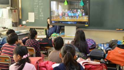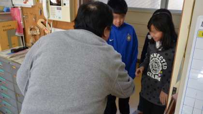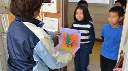 4年1組は、学級会でみんなでできることはないか話し合い、学校主事さん、調理主事さん、警備員さんなど、学校を支えている裏方さんに感謝の気持ちを表すことにしました。メッセージカードを作り、終業式の日にみんなに配りました。夜の警備員さんには直接わたすことができないので、カードは副校長先生にあずけ、メッセージはビデオで見てもらうことにしました。下の写真は、そのビデオのできばえの確認をしているところです。うれしいプレゼントですね。
