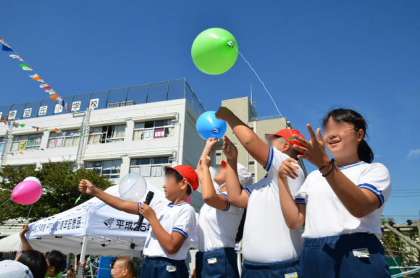 午前の部最後の種目は低学年リレー。1年生から3年生までの選抜選手が力走を見せました。全校ダンスの「ジンギスカン」を家族地域の方と一緒に踊った後、40周年記念で、メッセージカードをつけた風船を飛ばしました。