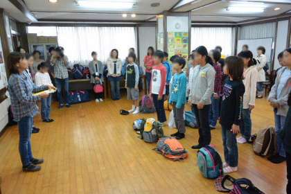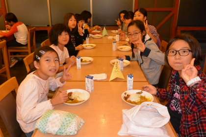 10月は、16日から2泊3日で5年生が川場移動教室に出かけました。ところが前日から台風が関東に接近。朝は強風が吹き荒れていました。予定より3時間以上遅れの11時に出発式をランチルームで行い川場村に向かい、1日目はスケジュールを変更して行いました。予定していた飯ごう炊さんも中止になり、食堂でカレーを食べました。