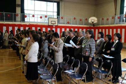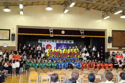 北原白秋の詩「おまつり」の群読をしました。詩の途中で1・2・3年生がお祭り装束でおみこしとともにサプライズ入場。会場がわきました。40周年記念歌「希望のつばさ」を大合唱。最後は会場の皆さんと校歌を歌って式典が大好評のうちに終了しました。