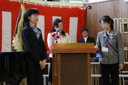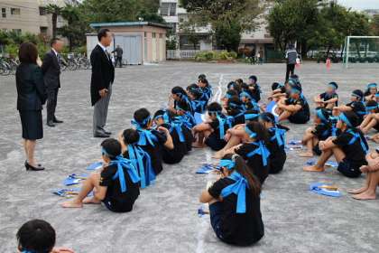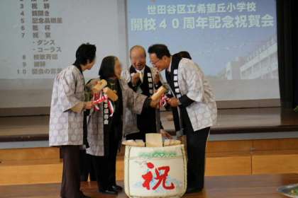 式典終了後、祝賀会の準備をする間、5・6年生が校庭で「みかぐら」を披露しました。お客様にも見ていただき、大きな拍手をいただきました。模様替えをした体育館で、実行委員会主催で祝賀会を催しました。