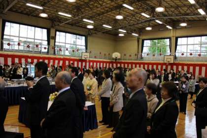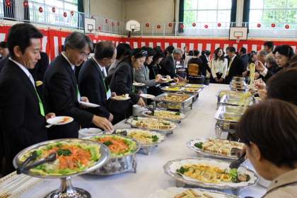 おいしい食事が並び、皆さんに大好評。アトラクションのダンスもダイナミックに展開し会に花をそえていただきました。最後は会場の皆さんと式典に引き続いて校歌を一緒に歌い、すてきな祝賀会となりました。式典・祝賀会でお世話になったスタッフの皆さんに感謝です。40周年記念事業として、1月に展覧会を行います。ぜひ多くの皆様にご覧いただきたいと思います。