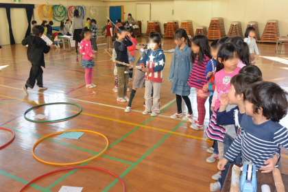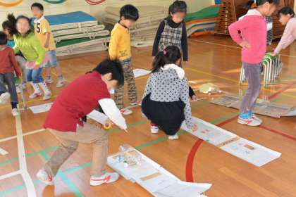 2年生が生活科で学習したゴムの力で動くおもちゃづくりの成果を生かして、1年生に遊んでもらう会を催しました。やさしくていねいに遊び方を教えている2年生が、とってもお兄さんお姉さんに見えました。