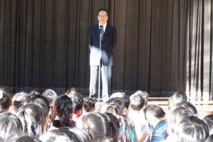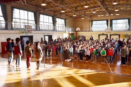 今年最後の話題は終業式。体育館で4人の代表児童が、今年の思い出と来年への抱負を語りました。それではよいお年をお迎えください。