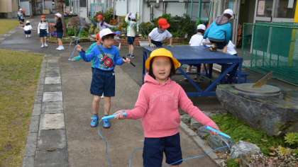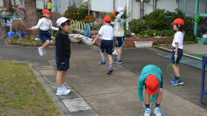 9日中休み、校庭で遊ぶ1年生。どんよりした曇り空で低い気温にも負けず、縄跳びに夢中です。できるようになった技がうれしいらしく、近づいていくとみんな「見て!みて!」かわいいですね。みんながんばっています。