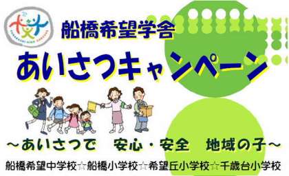 船橋希望中学校・船橋小学校・希望丘小学校・千歳台小学校で構成する「船橋希望学舎」では、平成25年度、地域・保護者の方々だれにでもあいさつができる子どもを目指し、四校合同で「あいさつキャンペーン」の取り組みを行っています。3学期、あいさつキャンペーンの充実を目的として、新たに名刺大の「あいさつキャンペーン」カードを、保護者、地域の皆様にお配りしました。登下校時間帯などに、できるだけ子どもたちに見えるように身につけ、あいさつ運動にご協力いただけると幸いです。ご協力よろしくお願いします。