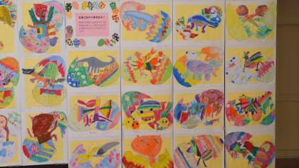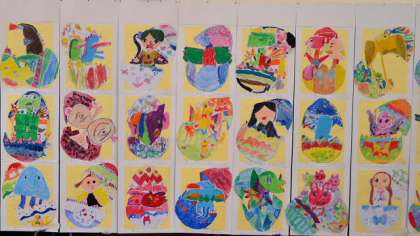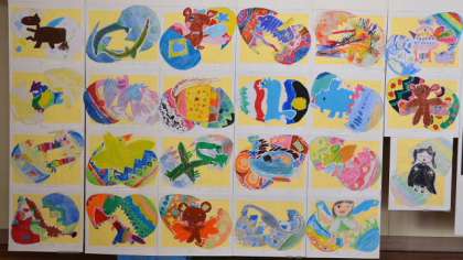 1年平面作品「たまごからうまれたよ!」希望丘小学校から謎のタマゴが発見されました。その中からどんな生き物が生まれてくるのでしょうか?子どもたちの発想とカラフルな色使いがすてきです。