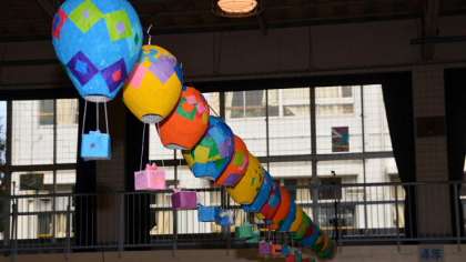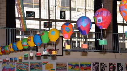 体育館頭上に展示した1年立体作品「ハッピー バルーン」風船に張り子をして、気球の型をつくりました。彩色して、ゴンドラには、かわいい人形を作って乗せました。どこへ旅に行くのか夢が広がります。