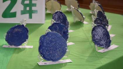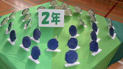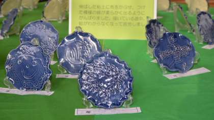 「ルリ色の皿」伸ばした粘土に布をかぶせ、つけた模様の線が柔らかく出るようにがんばりました。描いている途中、絵がわからなくなって苦労しました。単純な線が表現する世界も子どもらしくていいですね。