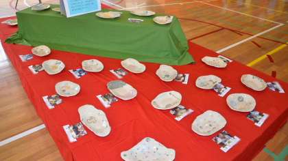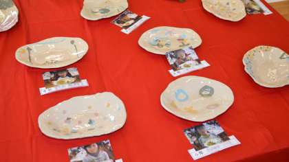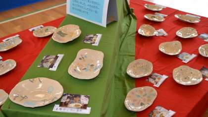 「カレー皿」たたら板を使って粘土をきれいに伸ばして形を作りました。4色のカラー粘土でデザインしたカレー皿。給食のカレーで使ってみました。展示の際、その時の写真ももそえました。家でもぜひ使ってみてくださいね。