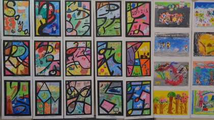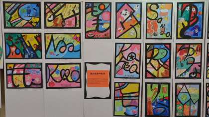 「私のたからもの」自分の名前をデザインして、名前の中に今の自分の大切なものを描き入れてあります。デザイン力はなかなかですね。