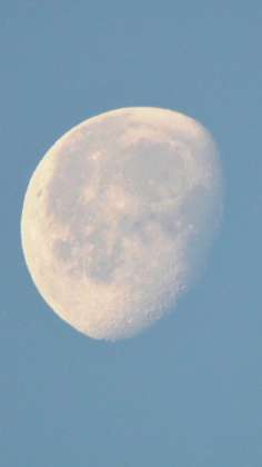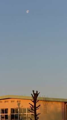 21日(火)朝、7時15分頃、東の空に見えた月です。青空にくっきりと白い月齢19の月。16日が満月でしたから、少しずつ欠けてきているところです。ちなみに月が沈んだのは9時頃。今晩はこの月よりもう少し右側が欠けて、10時頃に東の空に出てきます。忙しい毎日ですが、時には空を見上げてみましょう。今の時期、晴れた夜空にオリオン座がくっきりと見えています。