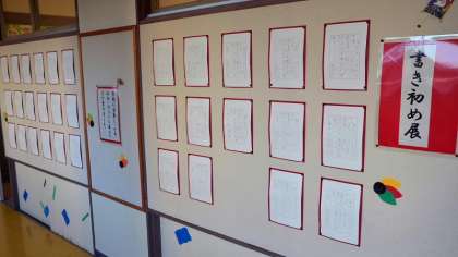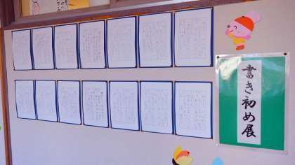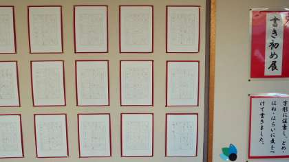 今週は明日23日まで学校公開週間。書き初め展も明日までです。各教室の廊下に子どもたちの作品が掲示してあります。写真は1・2年生の硬筆書写(鉛筆で書いています)です。