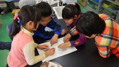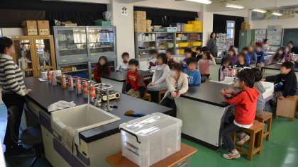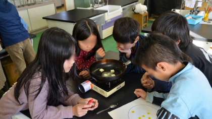 23日理数教育地区公開講座、ワークショップに続いて行った授業公開、4年背の授業のようすです。「もののあたたまり方」の導入の学習で、場所は2階、理科室です。ガスコンロの火の熱がフライパンにどのように伝わるか予想し、バターを使って調べました。身近な道具と熱の伝わり方から、今後授業を展開する動機付けを行いました。