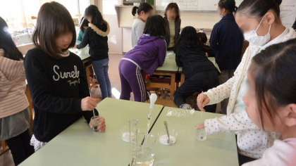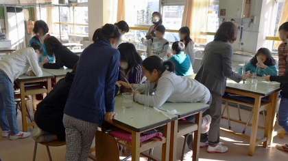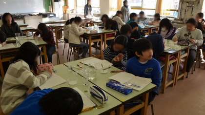 5年生の授業公開のようすです。「もののとけかた」の学習で、場所は3階家庭科室で行いました。食塩やミョウバンが水に溶ける量は決まっているのだろうか?という疑問から、水の量を増やしたらもっと溶けるか調べ、結果から考察する場面です。水に塩や食塩をひたすら溶かすという地味な実験ですが、子どもたちは興味を持続させて学習に取り組んでいました。