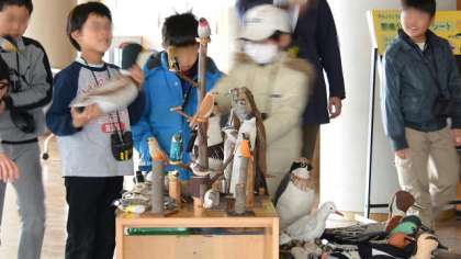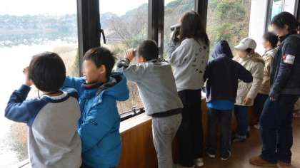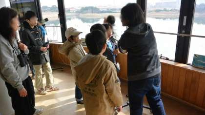 レクチャーの後、いよいよネイチャーセンターの建物内から野鳥観察です。持参した双眼鏡や、施設に備え付けのスポッティング・スコープ(望遠鏡)で、レンジャーの説明を受けながら観察をしました。アオサギやカワウなど、見方を教えてもらいながら夢中で観察していました。