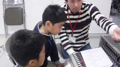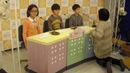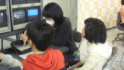 番組作り体験です。あらかじめ学校で撮ったビデオも交えて番組作りをします。カメラマンや編集、効果、ディレクターなど役割分担を決めて、それぞれ専門のスタッフの方に教えてもらいながら番組作りを進めました。