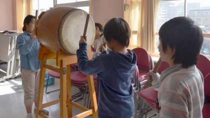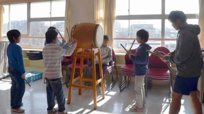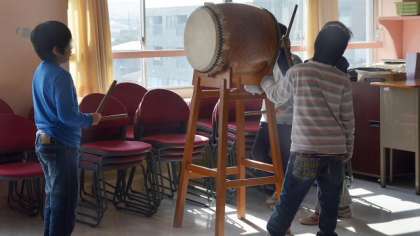 本校の伝統となっている「みかぐら」。もうすぐ6年生から5年生に引き継がれます。それを前に、6年生のリーダーが5年生の新リーダーに太鼓のたたき方を指導し始めました。一つ一つていねいにやさしく指導する6年生。さすがですね。