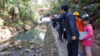 3年社会科見学、次は等々力渓谷の見学です。大井町線の等々力駅の近くでバスを降りて、階段を下っていくと、そこには別世界が。うっそうとした木々に囲まれた渓谷です。静かに流れる水の音と鳥の声が聞こえ。カモも泳いでいました。渓谷から等々力不動尊に上がりお参りもしてきました。