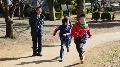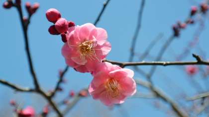 昼食を食べ終わって、公園で少し遊びました。3年生の子どもたちは好奇心旺盛で元気です。暖かい日差しで、梅の花が咲いていました。