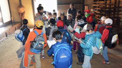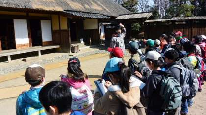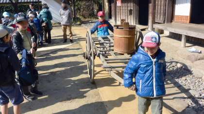 古民家の見学では、最初に公園を管理している学芸員の方から、家の造りのことや昔の生活についてお話を聞きました。大八車をひく体験も全員、させてもらいました。