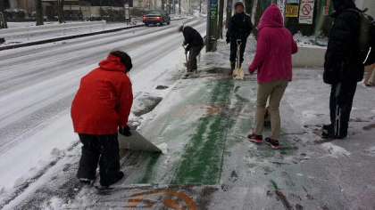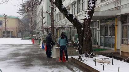 天気予報通り、土曜授業日の8日(土)、未明から雪が降りしきり、周りの景色は真っ白に変わっていました。しかし朝のうちはまだ積雪量も少なく、心配していた通勤通学への大きな影響もなかったため、早めに家を出た職員が学校の周りで雪かきをしたり、校庭の保護のための作業をしました。