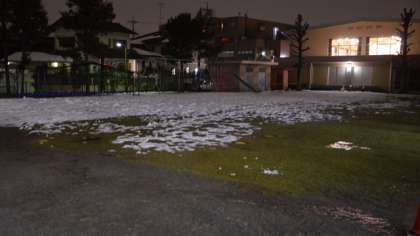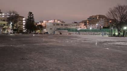 校庭の降り積もった雪が、10日の気温上昇と日差しで、写真(10日19時撮影)のように、だいぶとけました。朝のうちに融雪剤をまいた効果も少しはあったようです。しかし11日は気温も低くまだとけきっていません。校庭がもとのように使えるようになるまで、まだしばらくかかりそうです。