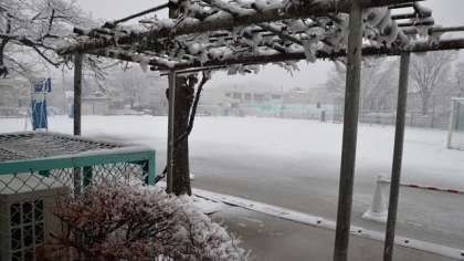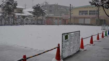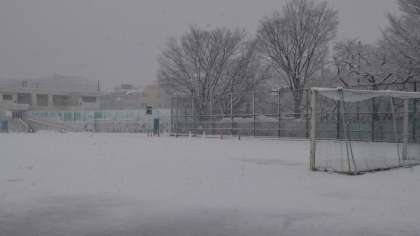 14日、朝から降り続いた雪で校庭は真っ白。道路にも昼過ぎから雪が積もり始めました。先週に続き毎週末のこの天気。せっかく校庭が使えるようになったのに、またしばらく我慢になりそうです。