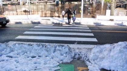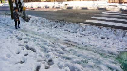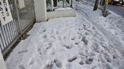 14日の大雪で、16日になっても、校舎の陰になり日当たりが悪いせいもあって、写真のように校舎の北側道路と玄関前はまだ雪がとけずにつもっています。そのままにしておくと、朝の冷え込みで凍り付き、登校に支障が出そうです。16日は天気がよくなり、雪も柔らかくなったので、先週に引き続き除雪をすることにしました。