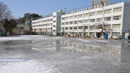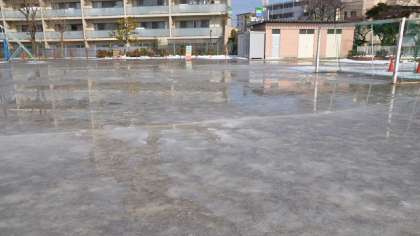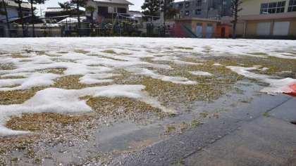 17日、雪解けのようすです。今日は天気がよかったので、午後1時頃には雪がどんどんとけ始めました。芝生は春の雪解けといった風情です。