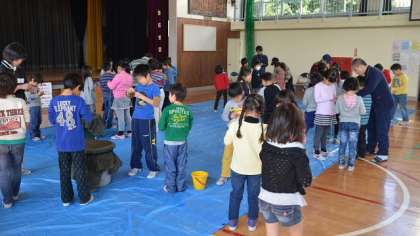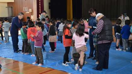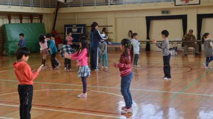 17日(月)3・4校時、体育館で1・2年生が、近隣地域にお住まいの方々のグループ、「輝く目の会」の皆さんをお招きして、「昔遊びの会」を行いました。今日は「ベイゴマ」と「竹とんぼ」です。前半後半2グループに分かれて、昔ながらの遊びを教えていただきました。