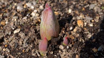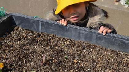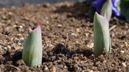 秋の希望っ子班ロング集会のときに、みんなで植えたチューリップの球根が芽を出し始めました。寒い日が続き、雪も降ったのに、春は一歩一歩近づいてきています。卒業生を送るころ、そして新入生を迎えるころに、きれいな花を咲かせてくれるとうれしいですね。