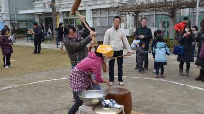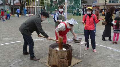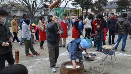 交代で次々と餅をつきます。かえしを担当する委員会の方と息もぴったりです。