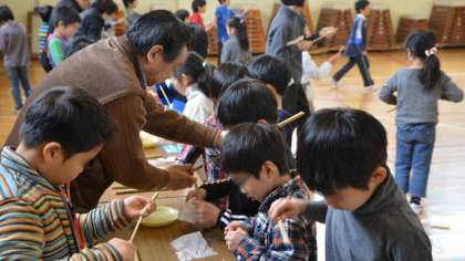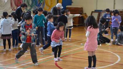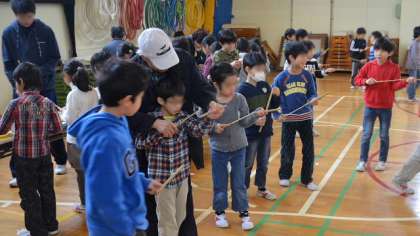 先週に続いて、24日(月)の3・4校時、体育館で「昔遊びの会」を行いました。今回も「かがやく目」の会の皆さんに指導していただきました。今日は「紙玉鉄砲」と「けん玉」に挑戦です。紙玉鉄砲は、会の皆さんが手作りした竹筒にティッシュペーパーを水で少し濡らして筒の両端に詰め、押し棒で勢いよく押します。隙間なく詰めるのがこつですが、これがなかなか難しいのです。でも、うまくいったときのうれしそうな子どもたちの顔。いいですね。
