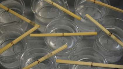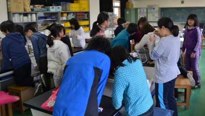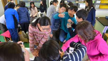 3日1校時、5年生が先週の28日金曜日に理科実験で仕込んでおいた、ミョウバンの結晶をいよいよあけることになりました。期待半分、不安半分で発泡スチロールの箱を開けてみると・・・おそるおそるビーカーを取り出してのぞき込む子どもたち。・・・できています。