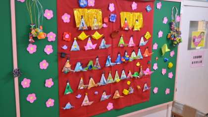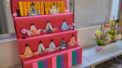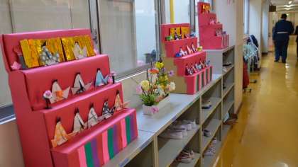 桃の節句、新BOP室の前にも手作りの雛飾りが。1階の廊下に華やかな彩りを添えています。