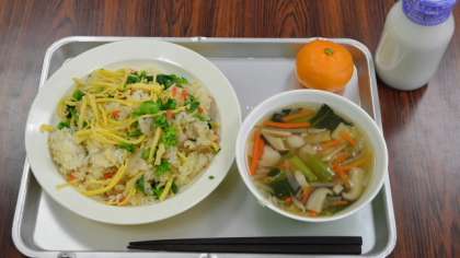 桃の節句にちなんだ給食メニュー。なばなの緑が色鮮やかな「菜の花寿司」。具がたくさん入って栄養のバランスがとれる「沢煮椀」。「沢煮」の由来は、具を沢山煮るからという説もあるようです。