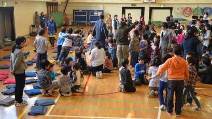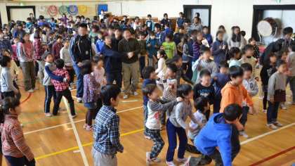 続いて全校ゲームで楽しみました。ゲームは集会委員会が考えました。名付けて「思いでづくりをしようよゲーム」です。ルールはご存じ「猛獣狩りゲーム」と一緒です。「もうじゅうがりをりをしようよ!」の代わりに「おもいでづくりをしようよ!」のかけ声で、その後の言葉の音の数の人数で学年を超えてグループをつくるというゲームです。かけ声を掛け合いながら、楽しくできました。