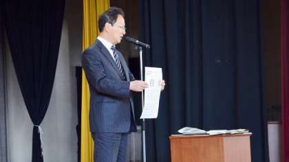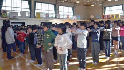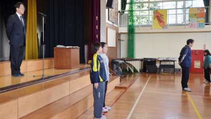 10日月曜朝会は、朝のうち強風が吹き荒れていたため、急遽体育館で行いました。整列した子どもたちの前に、5年生のあいさつ当番が出てきて、「先生方と朝のあいさつをいたしましょう。おはようございます。」と礼儀正しく大きな声で先導して、全員がしっかりとあいさつできました。今朝はまず最初に校長講話で「自律」について述べました。