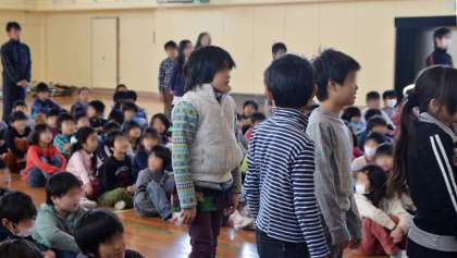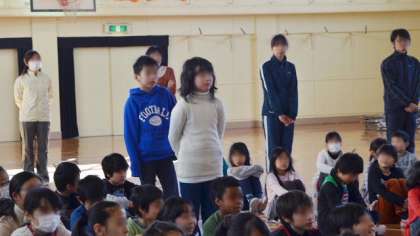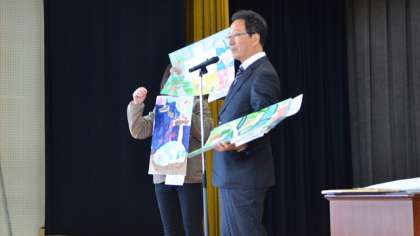 続いて朝会では、アジア大都市ネットワーク21(ANMC21)「アジアの子供たちの絵画展 —100年後のまちとくらし—」の公募に応じて子どもたちが描き、出品した絵が戻ってきたのでその絵と描いた子どもたちを紹介しました。この絵はベトナムのハノイでも展示されたものです。子どもたちの個性と想像力あふれる絵に感心します。