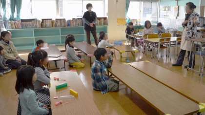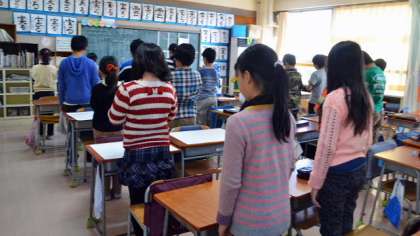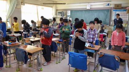 3月11日(火)2時46分、東日本大震災の犠牲者の方々に捧げる黙祷を全校で行いました。それに先だって、放送で東日本大震災についての講話を数分間行い、定時に各教室で東北地方の方角を向いて姿勢を正し、黙祷しました。1年生は下校後でしたので、新BOPに来ていた子どもたちに、事務局長さんから話をしていただきました。