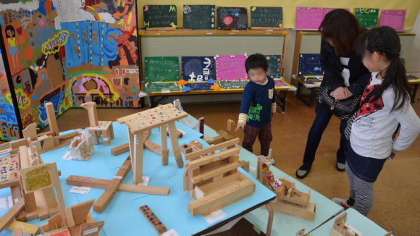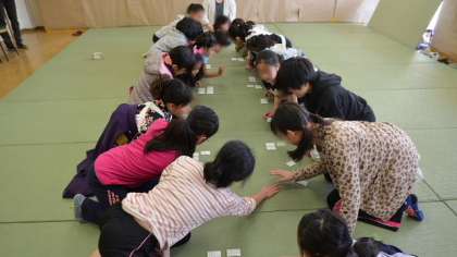 舞台発表はここで一休み。休憩時間に入ります。体育館以外の会場では、各くらぶの展示や実演をしているので、その様子も紹介しましょう。「ものづくりくらぶ」は工作の体験コーナーと作品展示です。子どもたちの個性あふれる作品が、会場に所狭しと展示してあり、華やかな雰囲気でした。「かるたくらぶ」は本格的な競技かるたに取り組んでいます。今日はいつもの練習の成果を実演して披露しました。